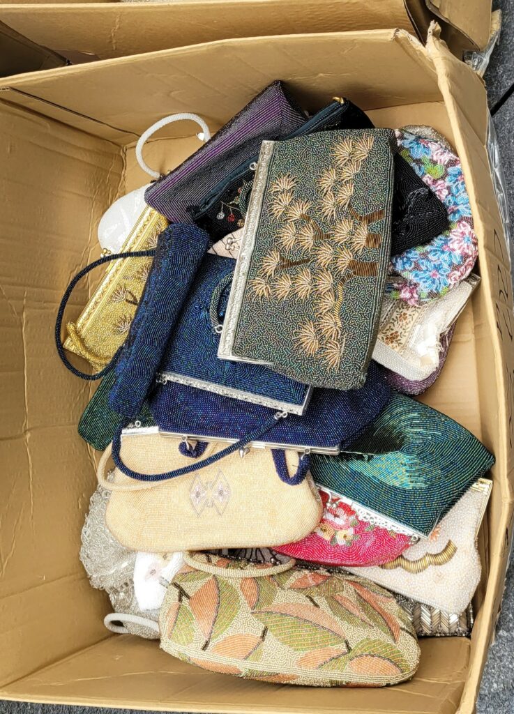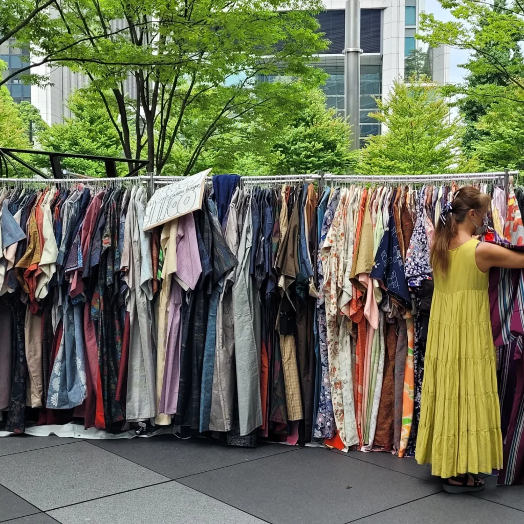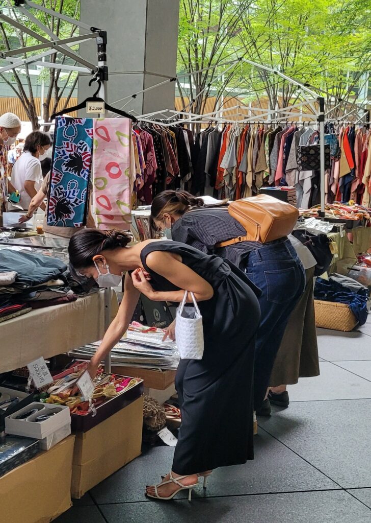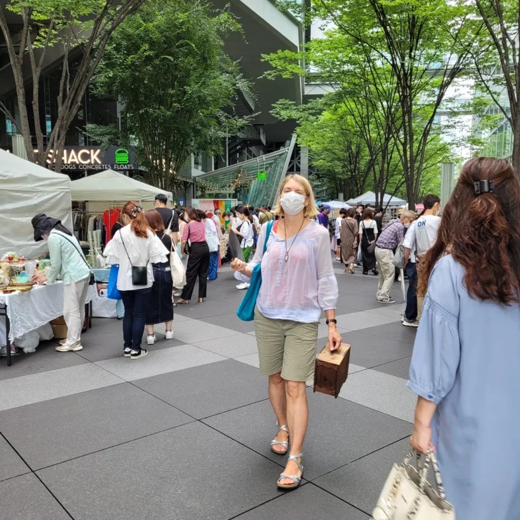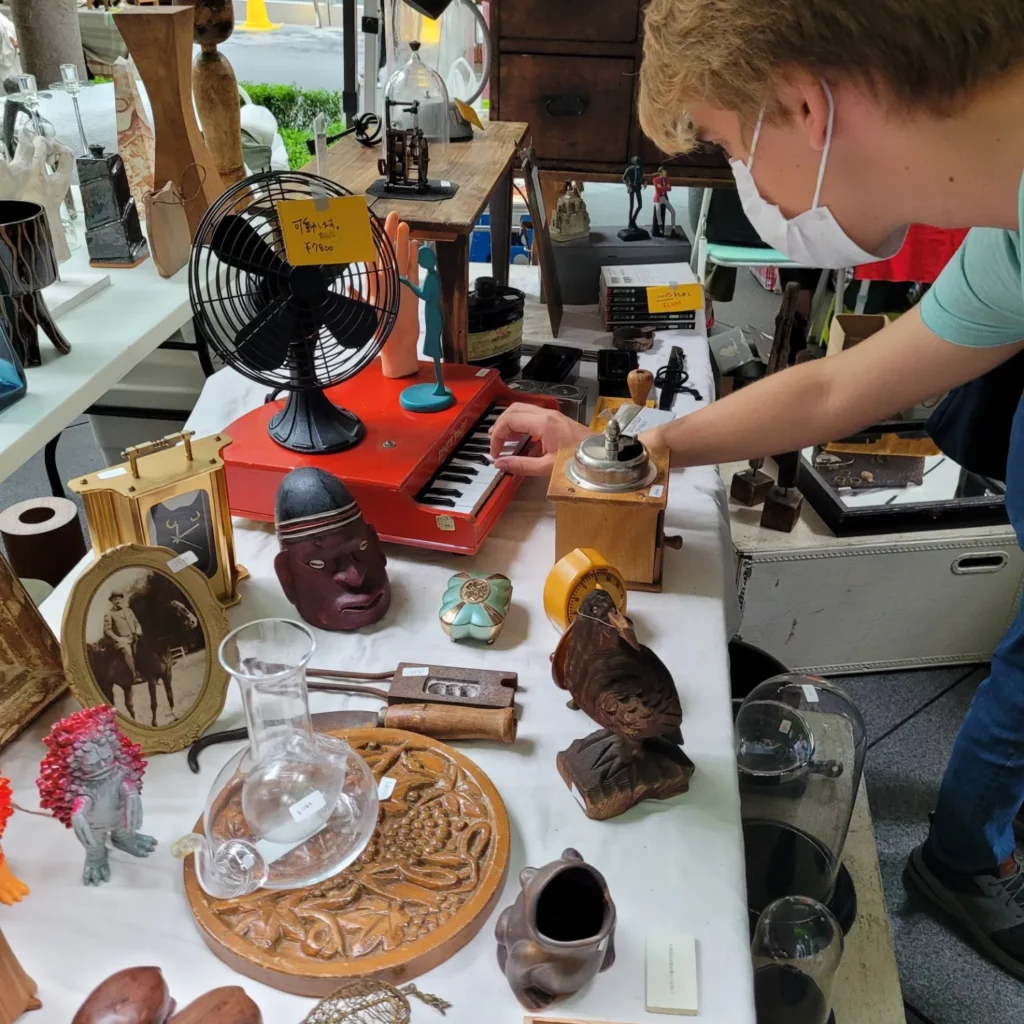 Der Markt ist bunt, es gibt alles für die Geisha, Kimonos und Kimonostoffe, Schuhe, alte Bilder und Kleinmöbel aus Japan und Teegeschirr. Daneben finden wir aber auch Modezeitschriften, Werbeplakate aus den 50-iger Jahren, Metallschilder, alte Hüte und Kleidung europäischen Ursprungs, allen voran Frankreich. Laurens erwirbt eine Briefmarkensammlung aus der UdSSR, für mich gibt es eine japanische antike Lunchbox, die später zur Aufbewahrung von Klo-Rollen im dem Gäste-WC dient 🙂